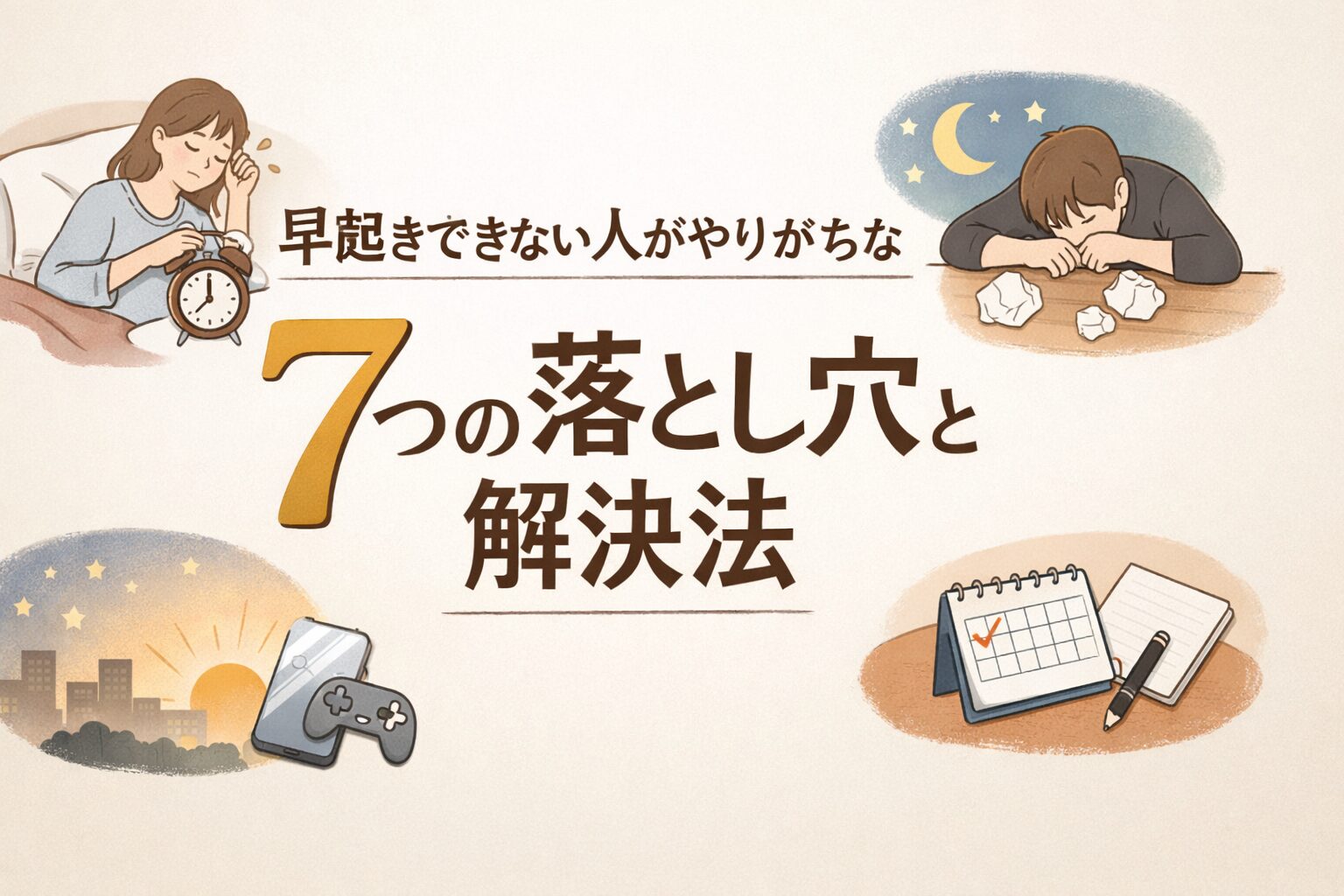 この記事では、早起きできない人がやりがちな7つの落とし穴と、その具体的な解決法を対話形式で整理していきます。