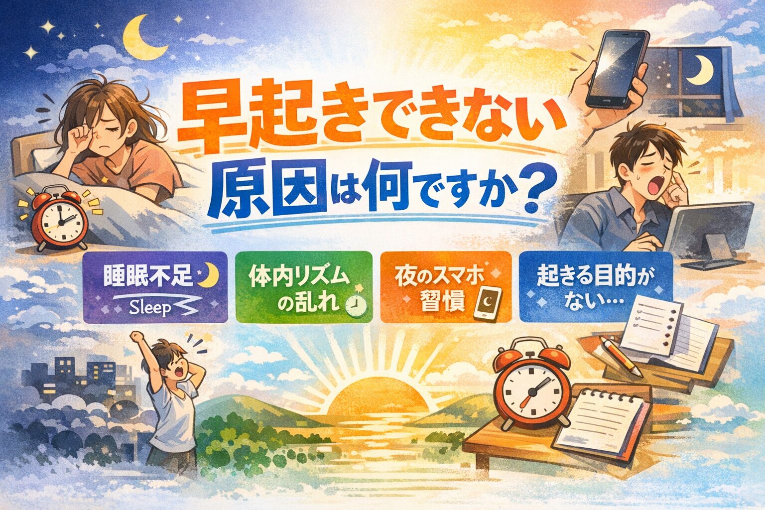 結論:早起きできない原因の本質は「意志の弱さ」ではありません。主な原因は①慢性的な睡眠不足、②体内時計(概日リズム)の後退、③夜間のスマホ・強い光刺激、④心理的ストレス、⑤起床後の行動設計不足です。これらが複合的に絡み合うことで、朝の覚醒スイッチが入らない状態になります。