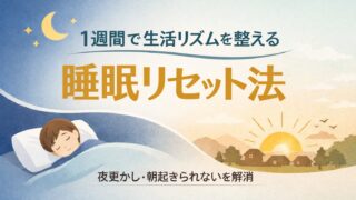 早起き 1週間で生活リズムを整える「睡眠リセット法」|無理なく朝型に戻す実践ガイド 生活リズムが崩れてしまい、「寝る時間も起きる時間もバラバラ」「早く寝ようとしても眠れない」と悩んでいませんか。 実はその悩み、意志が弱いからでも、努力不足だからでもありません。現代の生活環境そのものが、睡眠と生活リズムを乱しやすい構... 2026.01.05 早起き