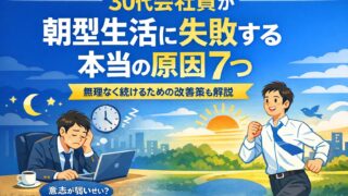 早起き 30代会社員が朝型生活に失敗する本当の原因7つ|無理なく続ける改善策も解説 「朝型生活に変えれば人生が変わる」そう思って挑戦したものの、続かなかった——。 特に30代会社員は、仕事の責任・体力の変化・家庭との両立などが重なり、思った以上に朝型生活に失敗しやすい年代です。 この記事では、 なぜ3... 2026.02.25 早起き